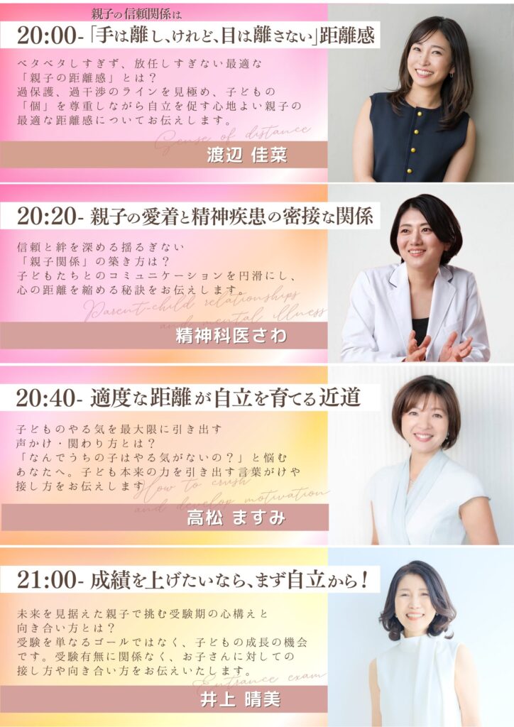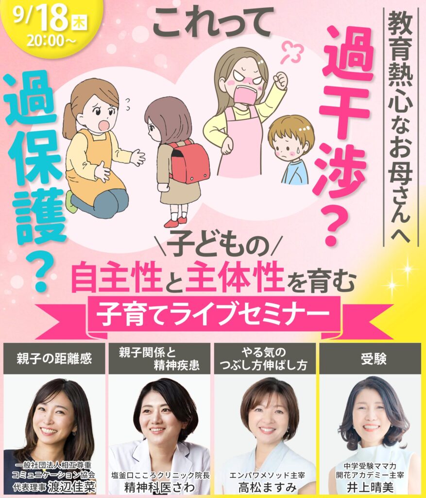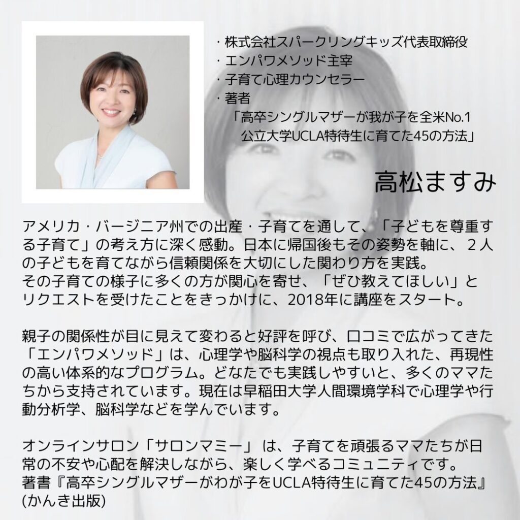 子どもたちが自信を持って未来へ羽ばたくために、ーーー今、私たち親ができることは何でしょう?ーーーこのセミナーは、その答えを見つけるための第一歩となるでしょう。ーーー「子育ての不安」を「未来への期待」に変えるーーーこの貴重なチャンスを逃さないでください!